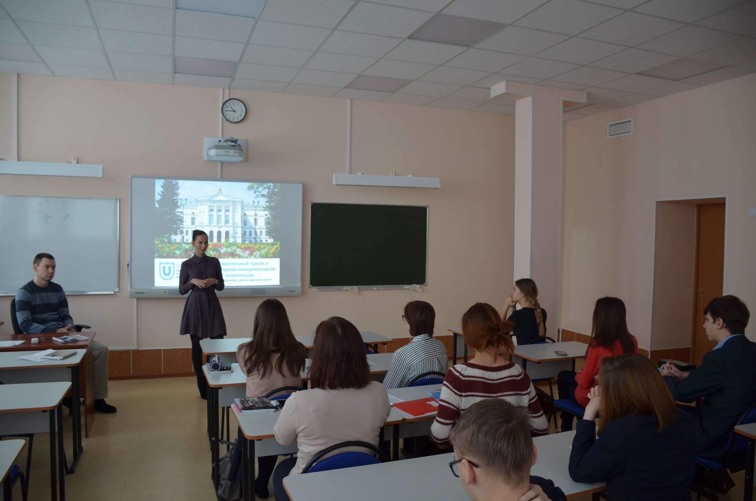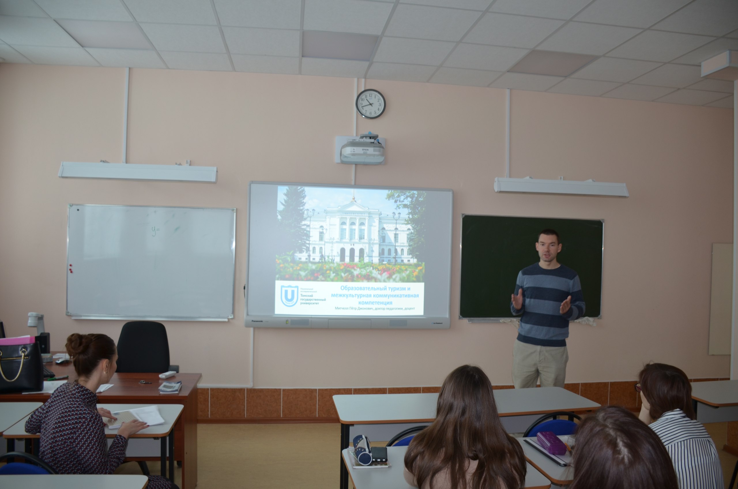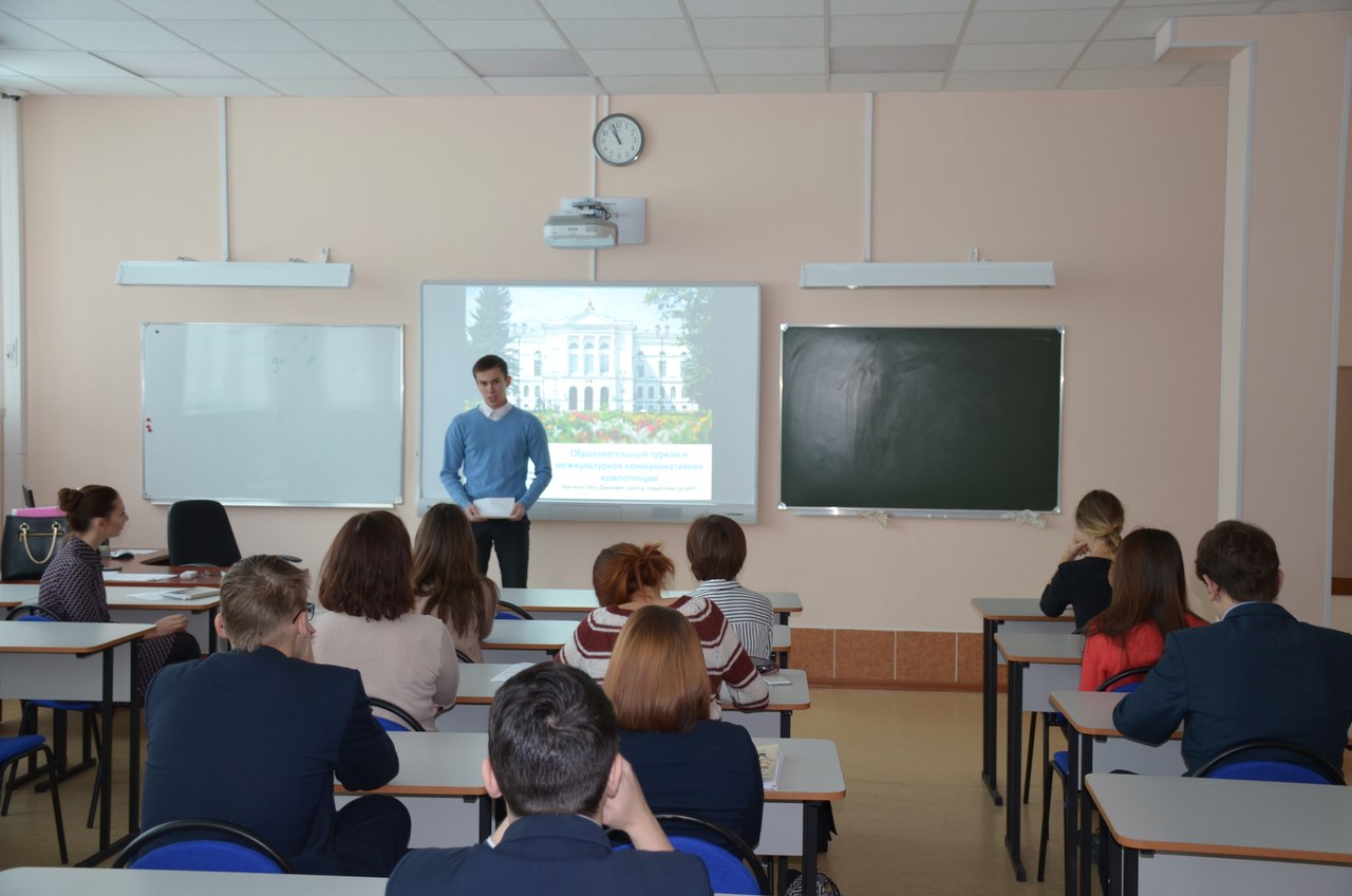 Абитуриентам, выбирающим в качестве своего будущего факультет иностранных языков Томского государственного университета, открываются широкие возможности в изучении языков, что приводит к таким положительным результатам, как расширение кругозора обучающихся, повышение уровня владения иностранным языком, взаимопроникновение культур, сближение стран и народов. Именно с такой мыслью в Гуманитарный лицей г. Томска пришли представители факультета, в число которых вошли Петр Джонович Митчелл, зам. декана по международным связям, Екатерина Дмитриевна Безносова, преподаватель французского языка кафедры романских языков, и Сергей Загайнов, студент ФИЯ ТГУ, будущий военный переводчик.