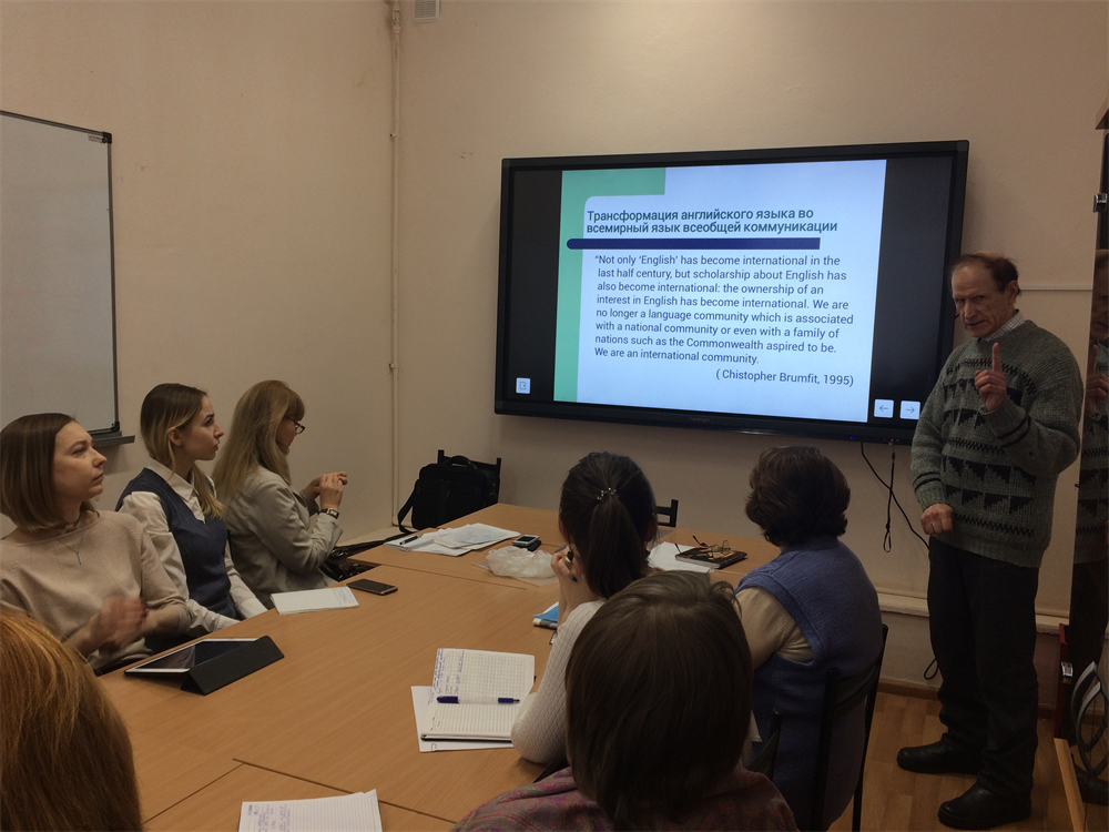 На этой неделе, на кафедре английского языка естественнонаучных и физико-математических факультетов состоялся научно-методический семинар под названием «Английский язык как язык всемирного общения: смена образовательной парадигмы». Профессор, доктор философских наук В.М. Смокотин поделился с сотрудниками и преподавателями кафедры своими мыслями о том, как развиваются современные языки, какие изменения они претерпевают в настоящее время, а главное, как влияет английский язык на другие языки мира и, в частности, на русский язык. Владимир Михайлович рассказал о понятии EGLF (English as the Global Lingua Franca), о проекте VOICE (Vienna-Oxford International Corpus of English), а также об изменениях образовательной парадигмы в результате приобретения английским языком глобального статуса и о факторах, обусловивших эти изменения. Кроме того, были затронуты вопросы о переходе на многоязычное образование (Европейский опыт) с целью сохранения языкового и культурного разнообразия, об Общеевропейских языковых компетенциях и Европейском языковом портфеле. В завершение семинара слушателями были заданы вопросы, на которые Владимир Михайлович ответил с большой готовностью. Коллектив кафедры и организатор мероприятия Шульгина Елена Модестовна выражают большую благодарность Смокотину Владимиру Михайловичу за предоставленную возможность узнать много нового и интересного в области лингвистики и межкультурного общения.