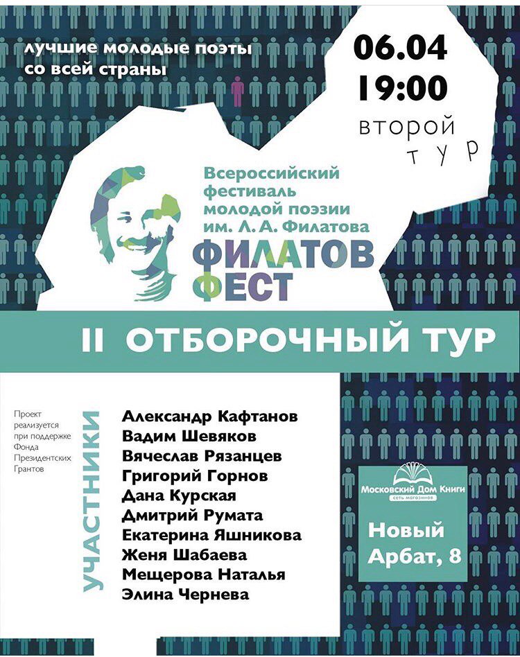 IV Всероссийский фестиваль молодой поэзии им. Л.А.Филатова «Филатов-фест-2018», названный в честь поэта и актера Леонида Филатова, был организован в 2014 году поэтом, актером и режиссёром, выходцем из Театра на Таганке Владом Маленко.