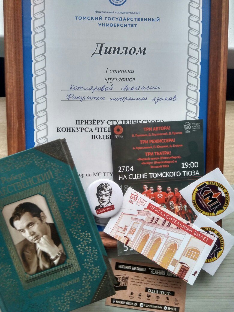 12 апреля в ТГУ прошёл творческий вечер поэзии о любви "Мне кажется, я подберу слова" (на мероприятии был отбор и предварительное прослушивание ), на котором выступила студентка нашей кафедры Анастасия Котлярова: она прочитала балладу Фридриха Шиллера "Der Handschuh" и стала призёром конкурса!