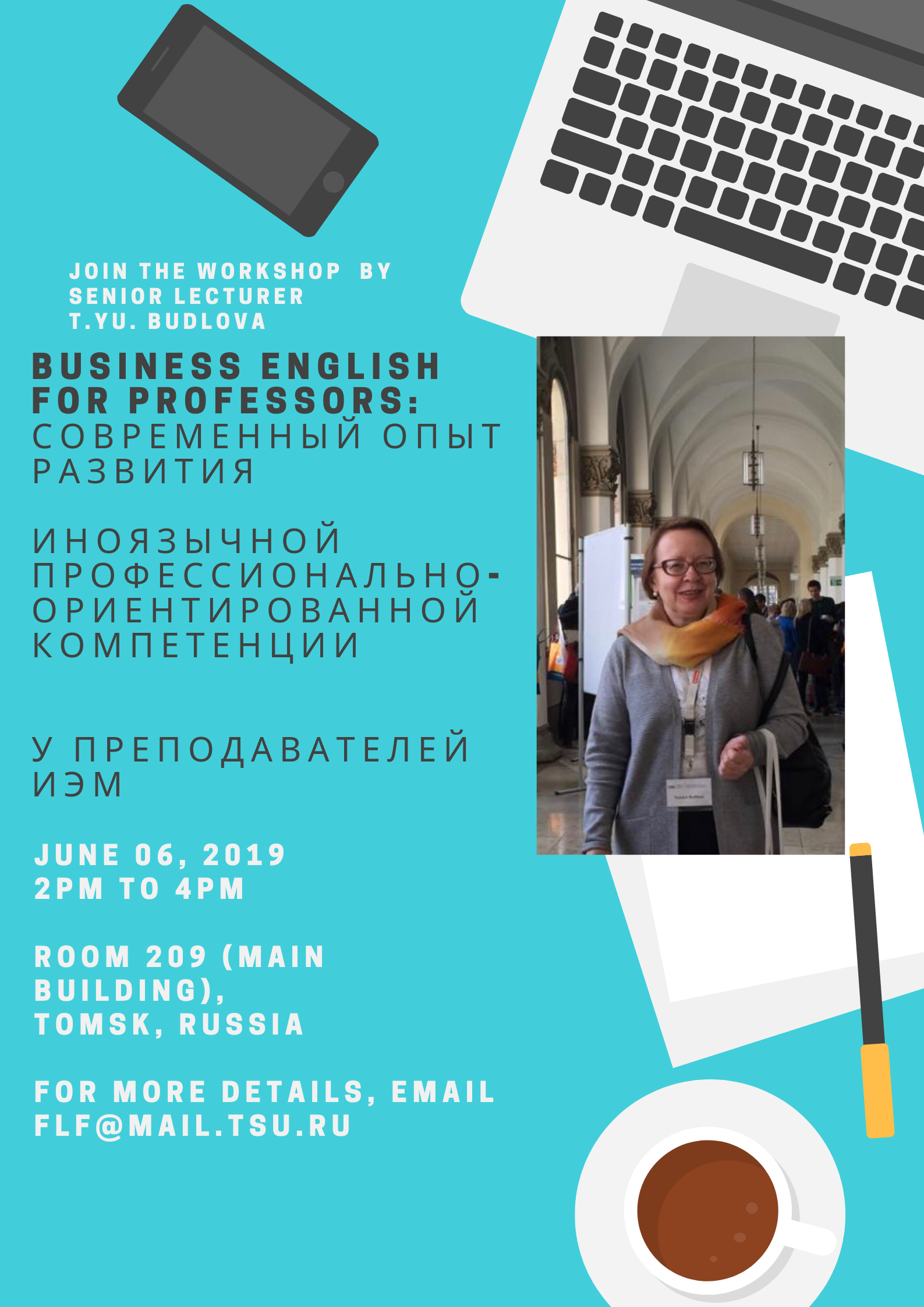 06 июня 2019 года в рамках проекта «Развитие языковой компетенции ППС ТГУ (неязыковые факультеты, английский язык)» состоится методический семинар-практика: опыт развития иноязычной профессионально-ориентированной компетенции в формате workshop с преподавателями ИЭМ. Приглашаются все желающих использовать английский язык в профессиональной сфере педагога.