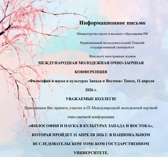 Факультет иностранных языков Национального исследовательского Томского государственного университета приглашает вас принять участие в IX Международной молодёжной научной очно‑заочной конференции «Философия и наука в культурах Запада и Востока».